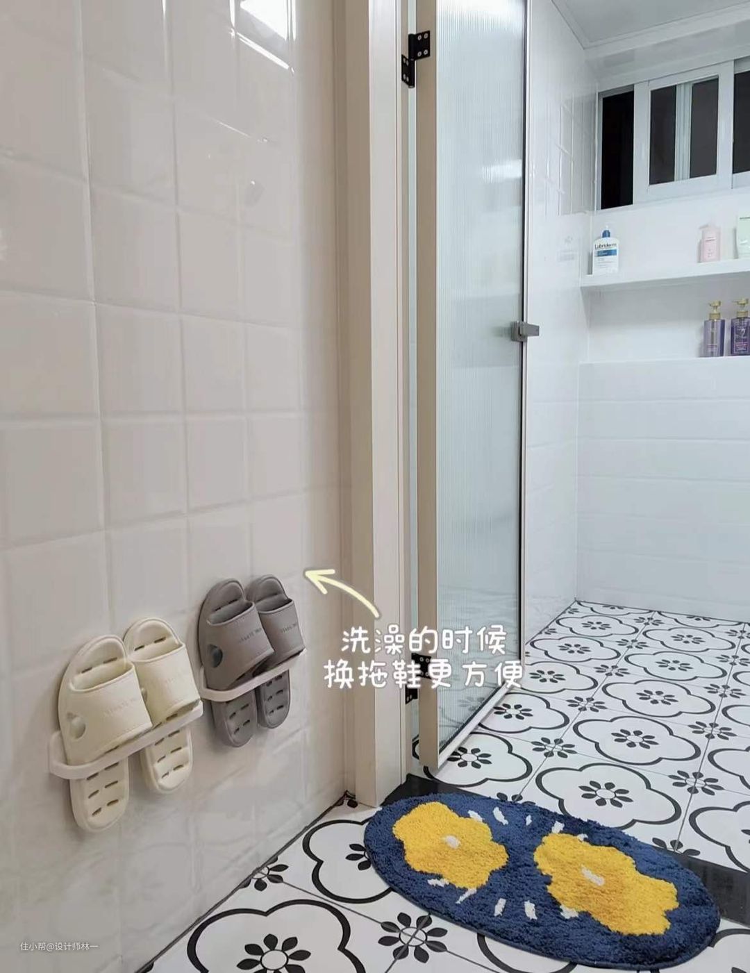 安排上了拖鞋架,洗完澡就把凉拖挂上去,换上干燥的棉拖,让湿区以外的空间保持干燥,更加整洁与安全。