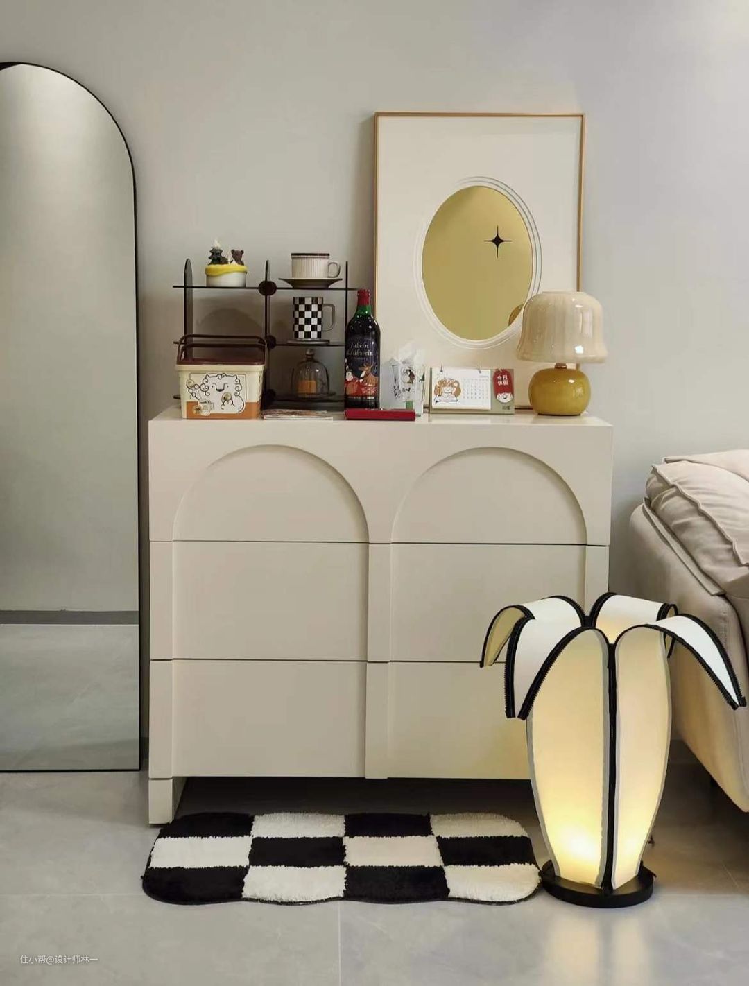 地面的香蕉灯造型别致,柔和的灯光又是制造氛围感的一把好手,美观又实用。