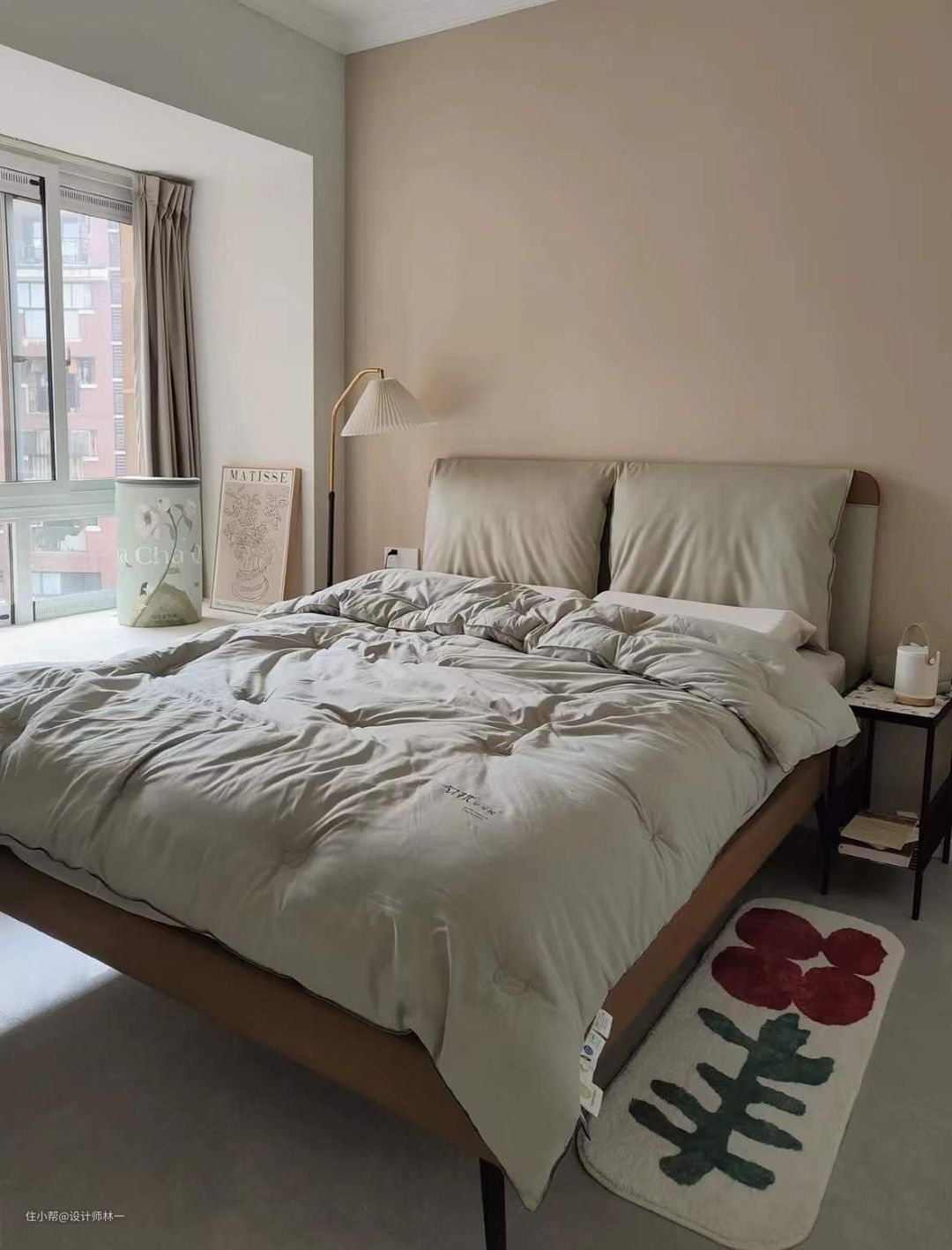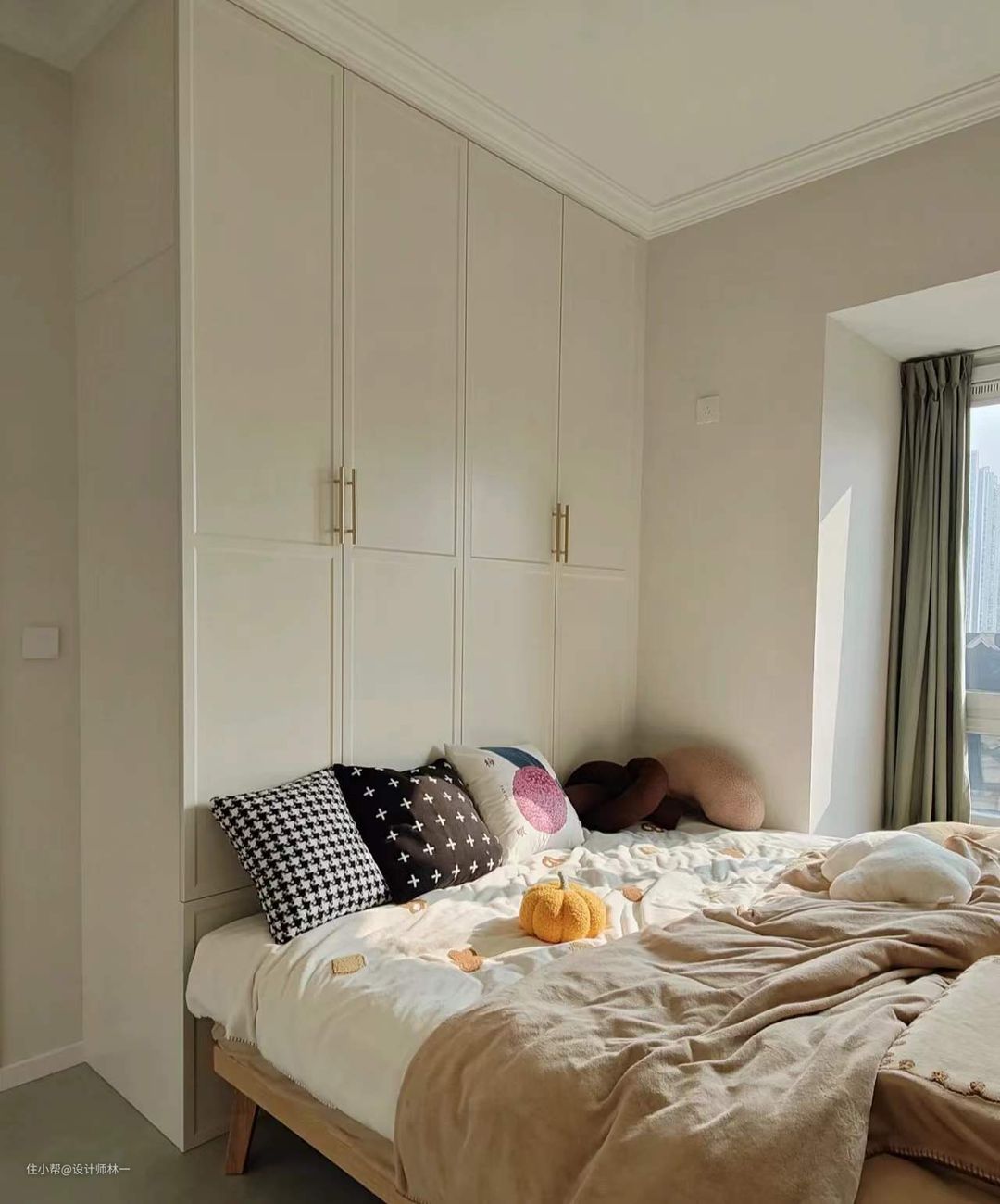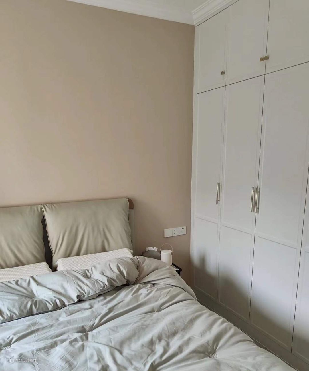 墙面通刷了立邦杏子灰,在灰调和奶油调之间平衡得刚刚好,温柔又不单调,绝美,即使阴天也不会显得暗,而是更加柔和;