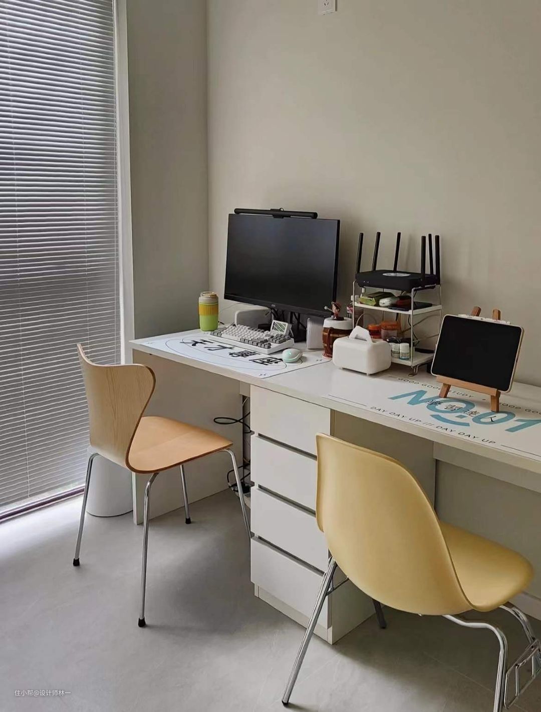 家里最小的房间改造为书房,打造了双人书桌,桌面是网购的颗粒板,长度1.8m,很结实,下方做了抽屉式的储物柜设计,不仅增加了储物空间还大大提升了柜体的实用性。