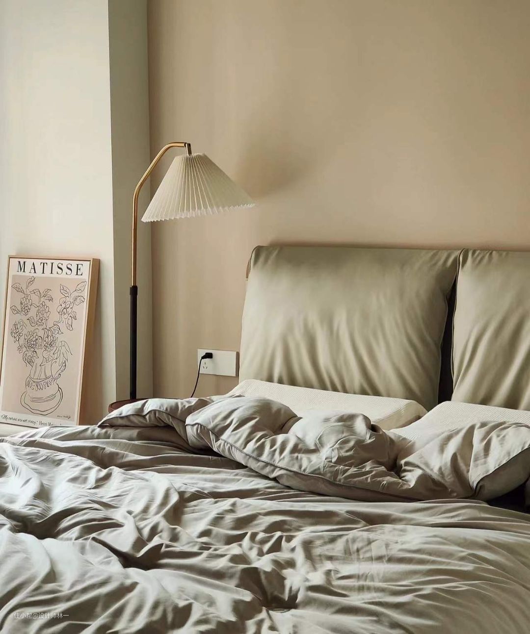 床头放置了百褶落地灯,直接向下投射,很适合睡前阅读,同时对于角落气氛的营造也十分实用。