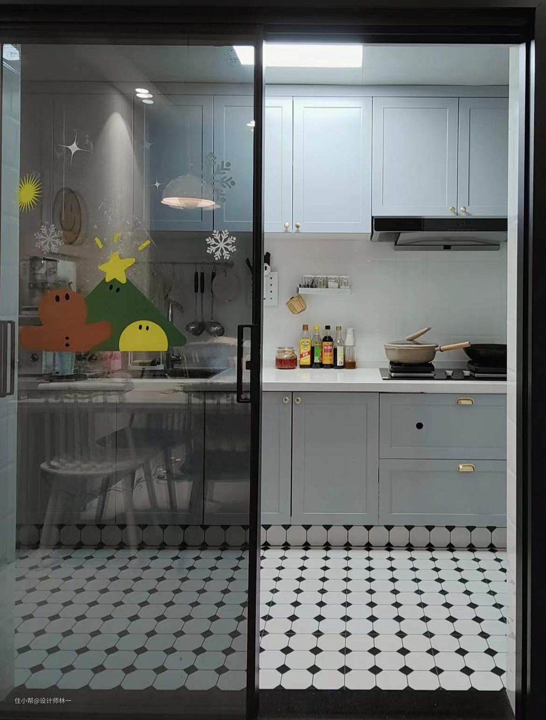 厨房门使用了玻璃推拉门,相比平开门来说更加节省空间,因为推拉门的开关方式是滑动的,不会额外占据空间,玻璃的通透性可以很好地与厨房外的家人、朋友保持一定的联系,有利于增加情感。