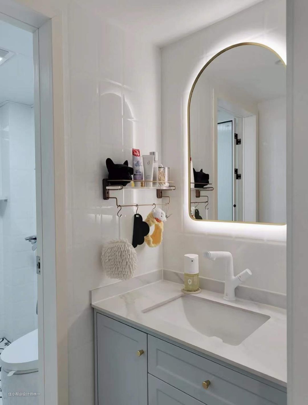 干区墙面设计了免打孔的置物架,收纳洗护用品,让台面干净整洁,营造每天舒畅的使用体验感。