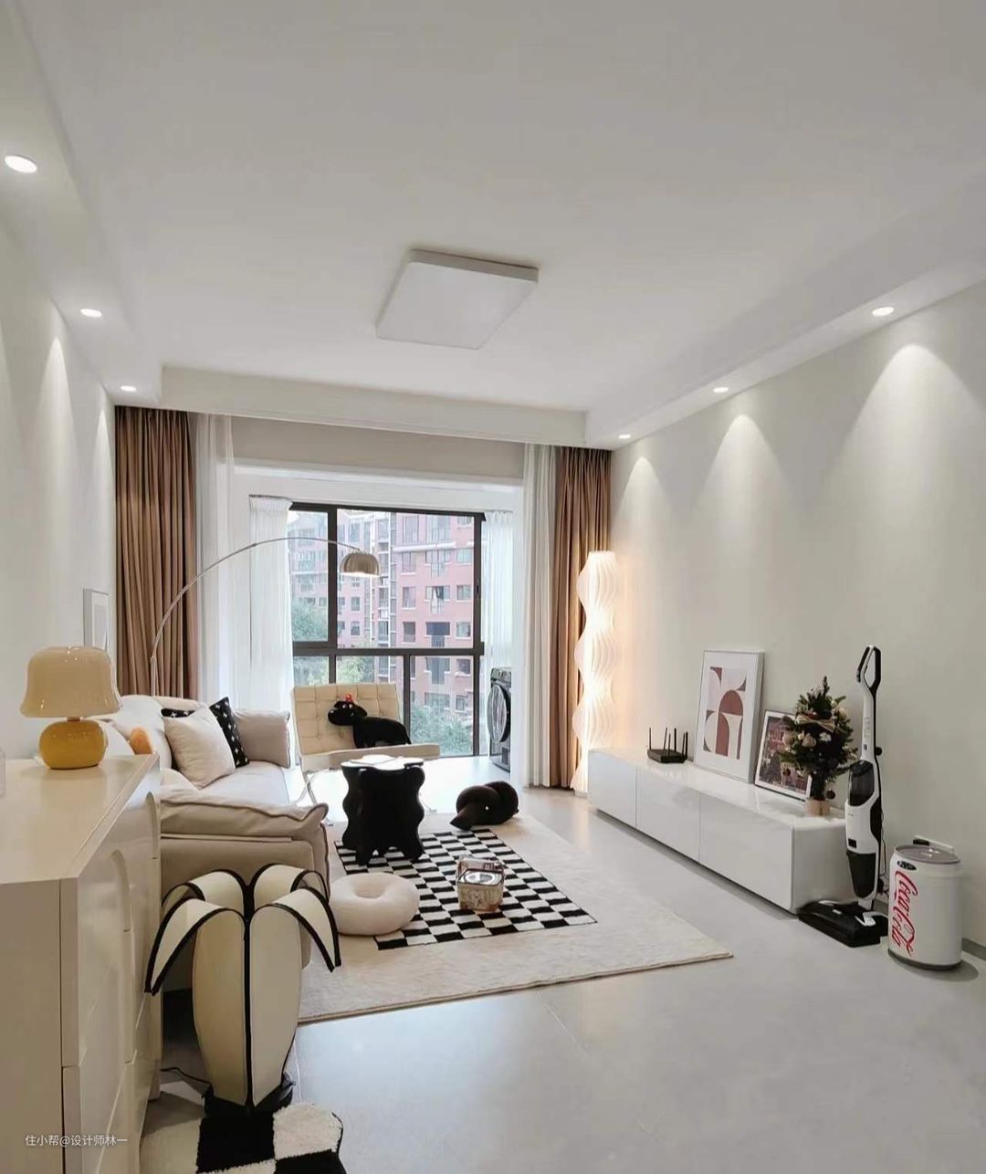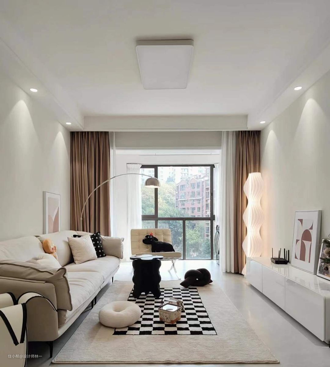 客厅软装以白色、米色为主,跟地面、墙面的颜色接近,不会显得突兀,反而还更加精致,整体性也更好,也在视觉上有显大的作用;
