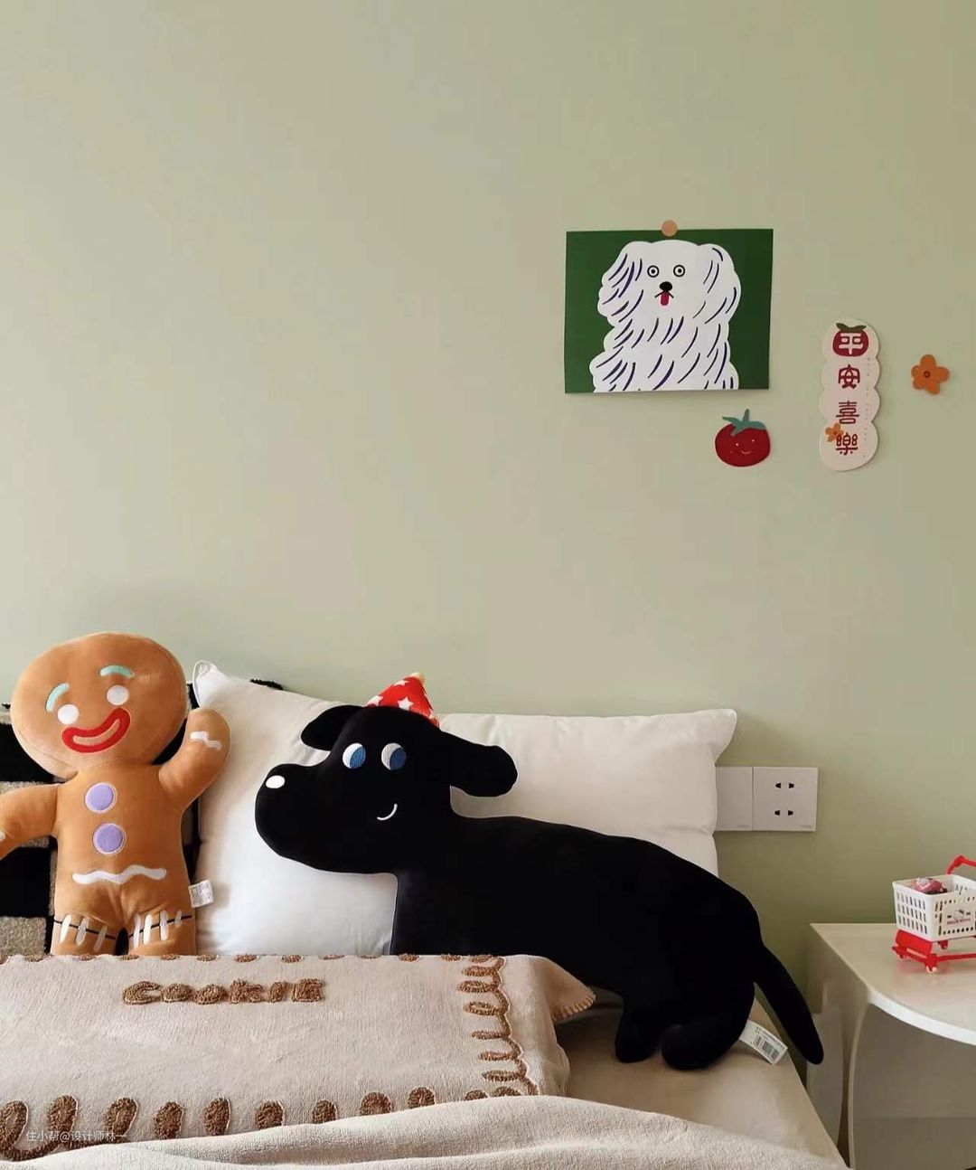 床头墙面做了贴纸设计,让房间的氛围更加小清新也更加活络。