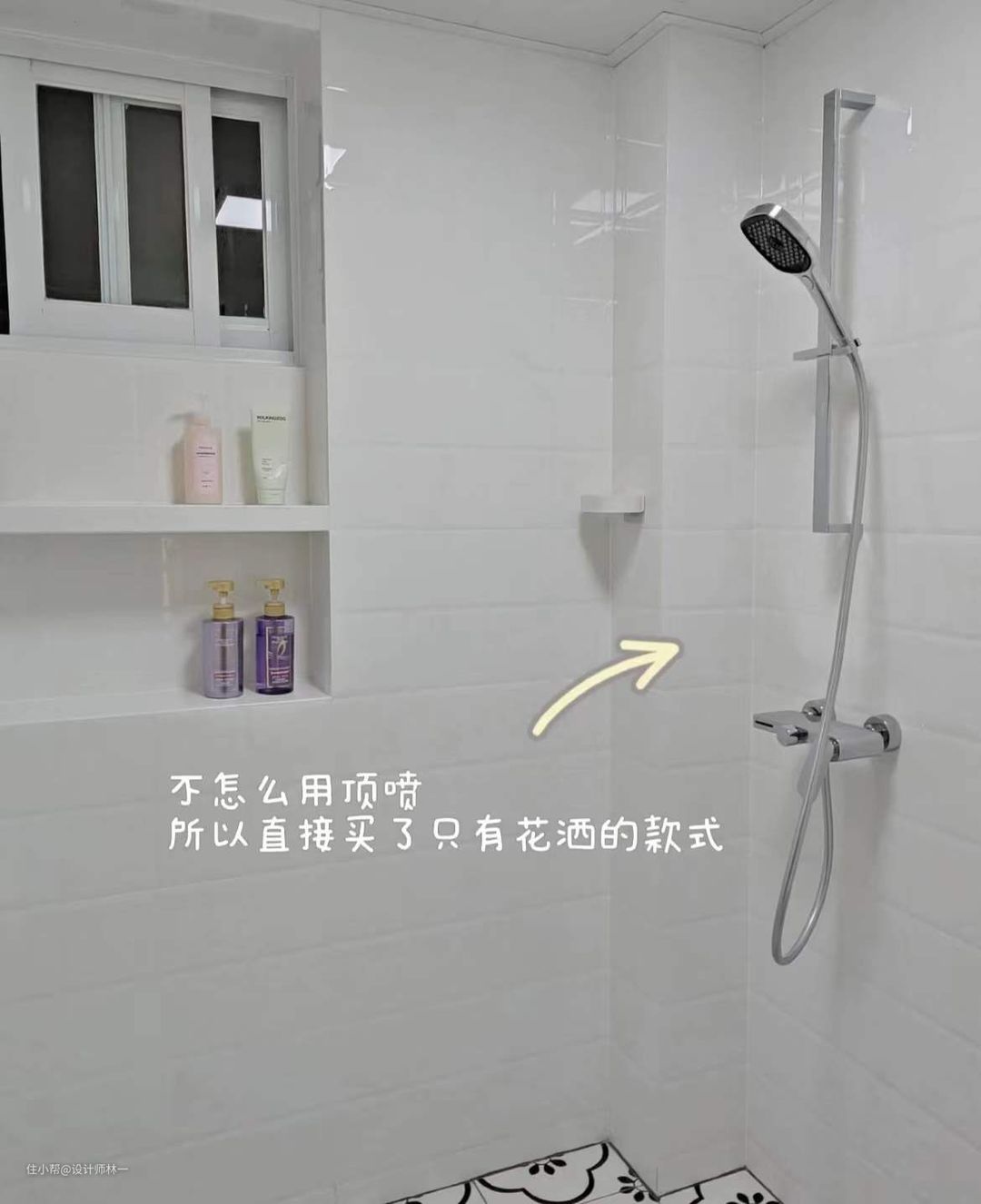 淋浴区原本是个大窗户,用下半截做了壁龛,有效地增加了收纳,让淋浴区地面更加整洁干净。