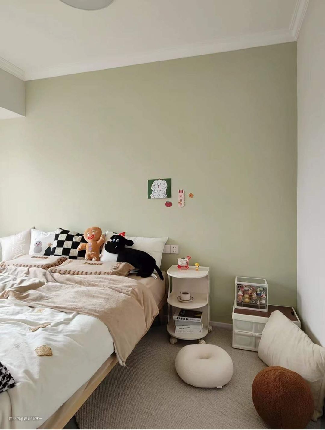床头没有使用床头柜,而是采用了小推车,更加灵活同时储物空间也更大,奶白色的外表,很温柔,也跟房间很搭。