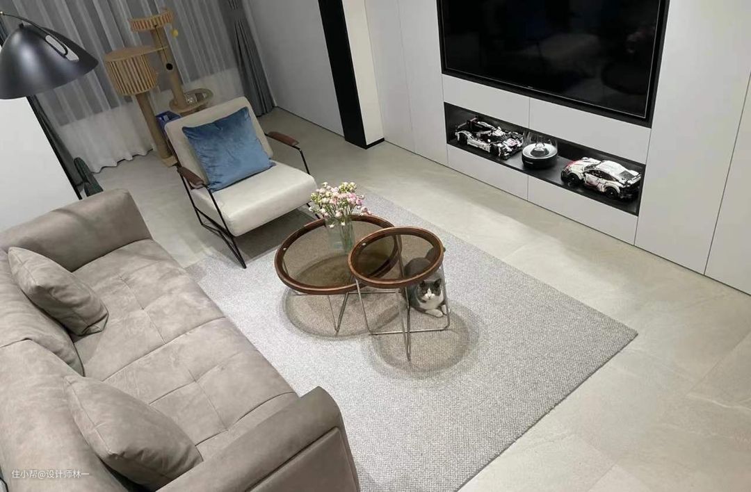 后期搭配了地毯,能提升客厅颜值,改变家居氛围,让空间瞬间就上升好几个档次!闲暇时可以直接坐在地毯上看电视,也可以充当亲子游戏区,方便家人互动。