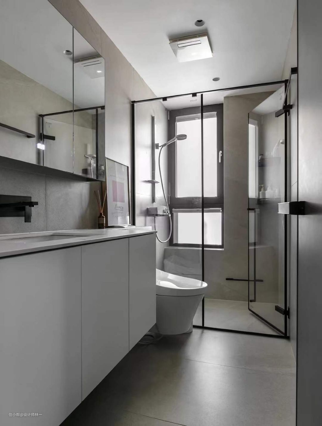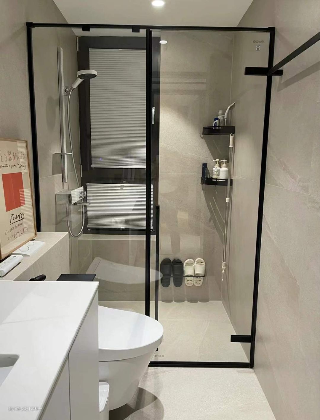 卫生间做了干湿分离设计,选用了同款墙砖和地砖,1.2m*0.6m的大砖上墙,缝隙减少了,自然显得更宽敞,选择了同色系的美缝,达到整个卫生间一体的效果。