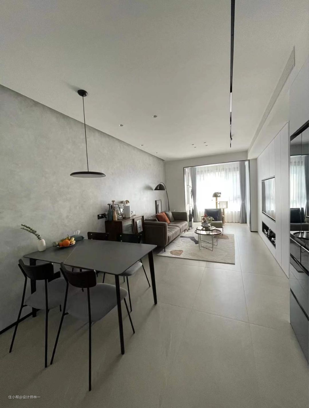 吊顶大约8-10公分,吊顶完层高2.76m,吊顶比较薄,所以没有选择太深的灯,选择使用了无边框射灯、磁吸轨道灯、灯带,沙发旁边增加一个钓鱼灯,让墙面看起来不那么单调,也让空间氛围感十足。