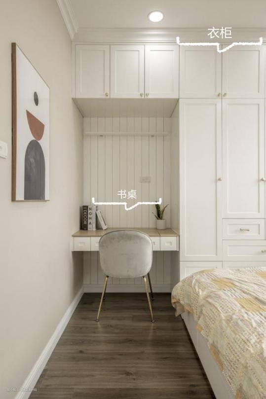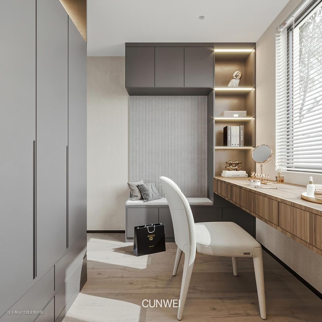 可以把衣柜和梳妆台放在一起设计,一下子解决了两个功能区的布置问题,当然梳妆台不仅可以化妆,也可以当作工作区,解决办公的问题。