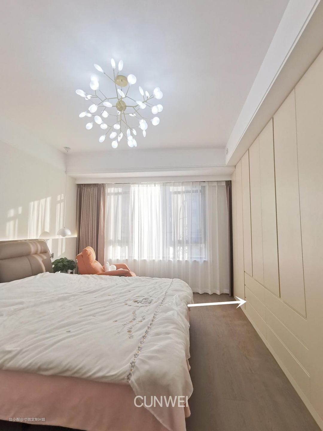 很多家庭都会买成品矮柜当床头柜,其实不如在定制衣柜时将衣柜延伸出一点充当床头柜,床头柜连着衣柜的设计从小细节中凸显质感,增加收纳空间,也完全不会有拥堵感。