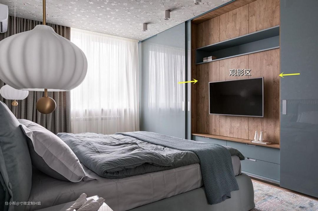 准备给卧室安装电视的,又想要更多储物空间的,完全可以考虑在床尾定制一整面衣柜+电视柜的组合柜,能够防止电视落灰,也很美观。一般长辈可能会比较喜欢看电视,把电视放在卧室,也不会影响别人的学习和工作。
