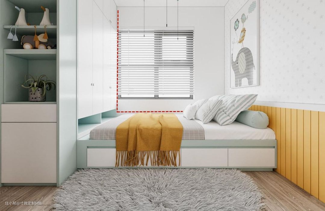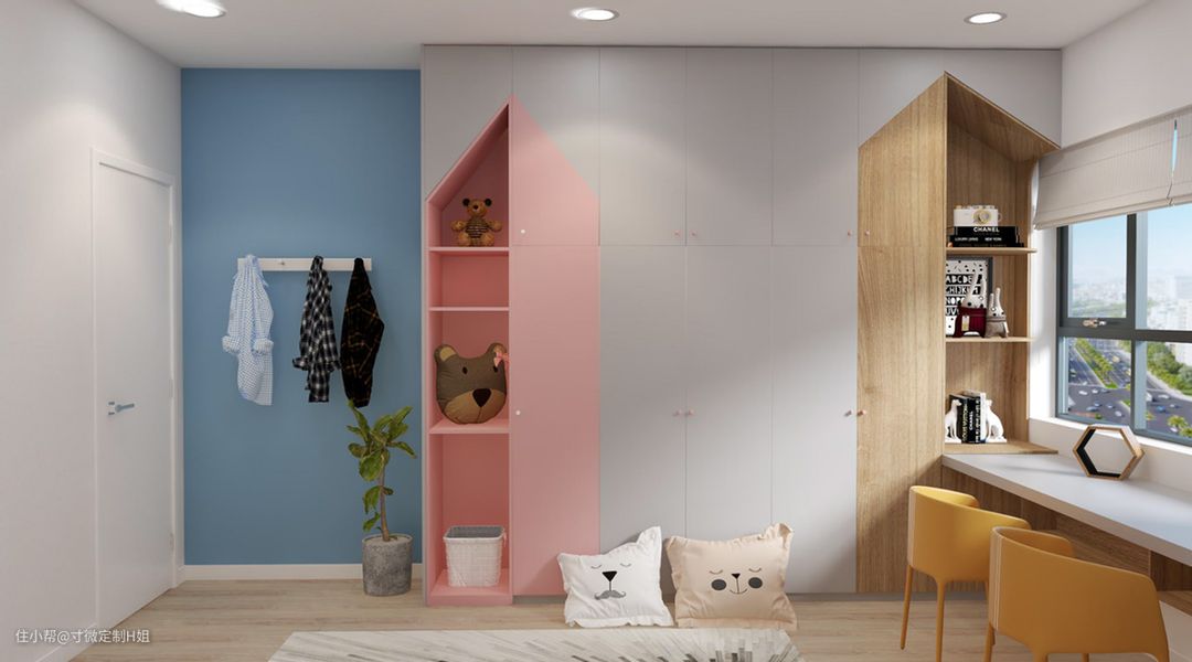 也可以在儿童房靠窗位置定制衣柜+书桌的组合柜,采光更好,给孩子提供一个良好的童年成长环境。
