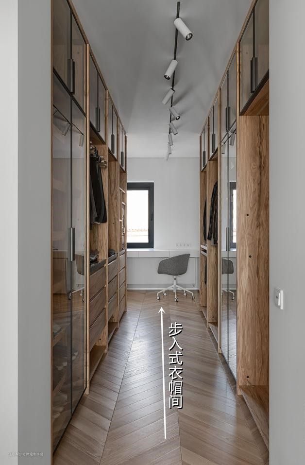 主卧空间面积足够的家庭,可以考虑在卧室定制两排到顶的衣柜,隔断出一个步入式衣帽间。