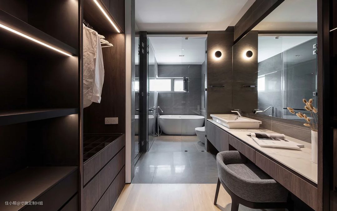 如果面积允许的话,也可以考虑连着卫生间的位置定制衣帽间,沐浴更衣,这样的动线布局更加合理。