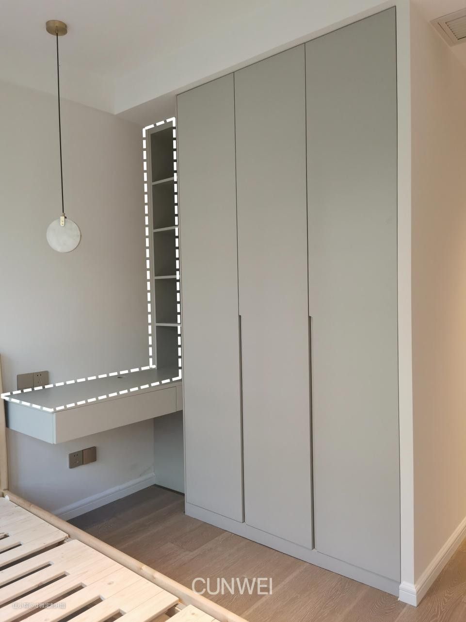 或者像这位业主家一样,利用墙面在靠窗位置定制衣柜+书桌一体式组合柜,满足衣物收纳、办公、学习三种不同的需求。