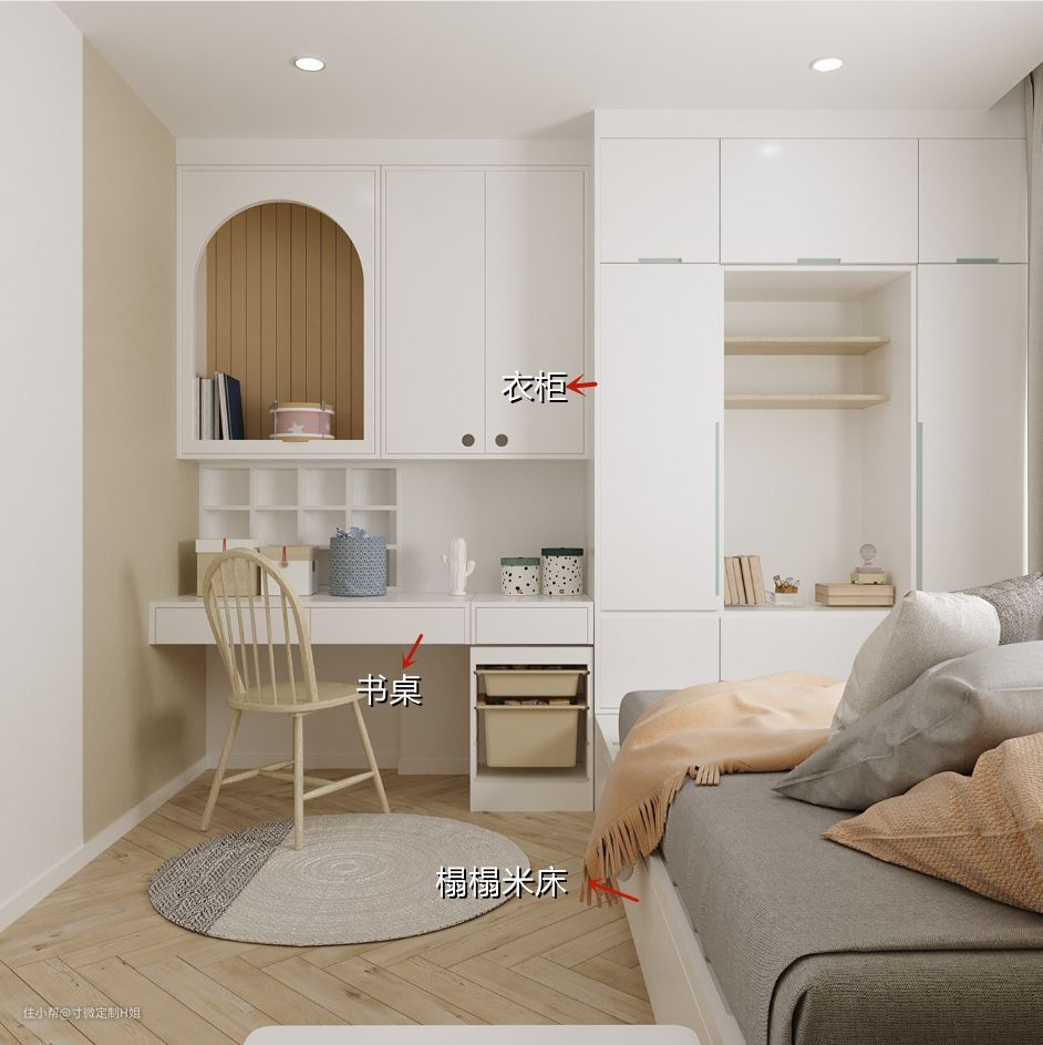 这位业主家的儿童房不大,于是就从衣柜里延伸出1米长的书桌,侧边柜设计的开放式书架,拿书也很方便,节省空间的同时让整个房间看起来也更加整洁。