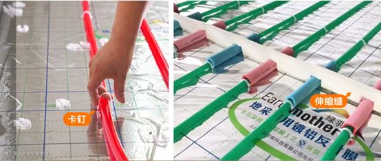 铺设盘管时用卡钉固定,一般直管卡钉间距500mm,弯管处用4~5个卡钉均匀固定。