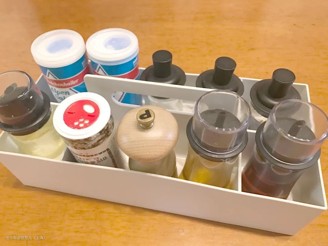 就是买一个收纳盒,把瓶瓶罐罐统一放进去,做饭时整盒拿出来摆在台面上,做完饭再放回去,方便又干净。