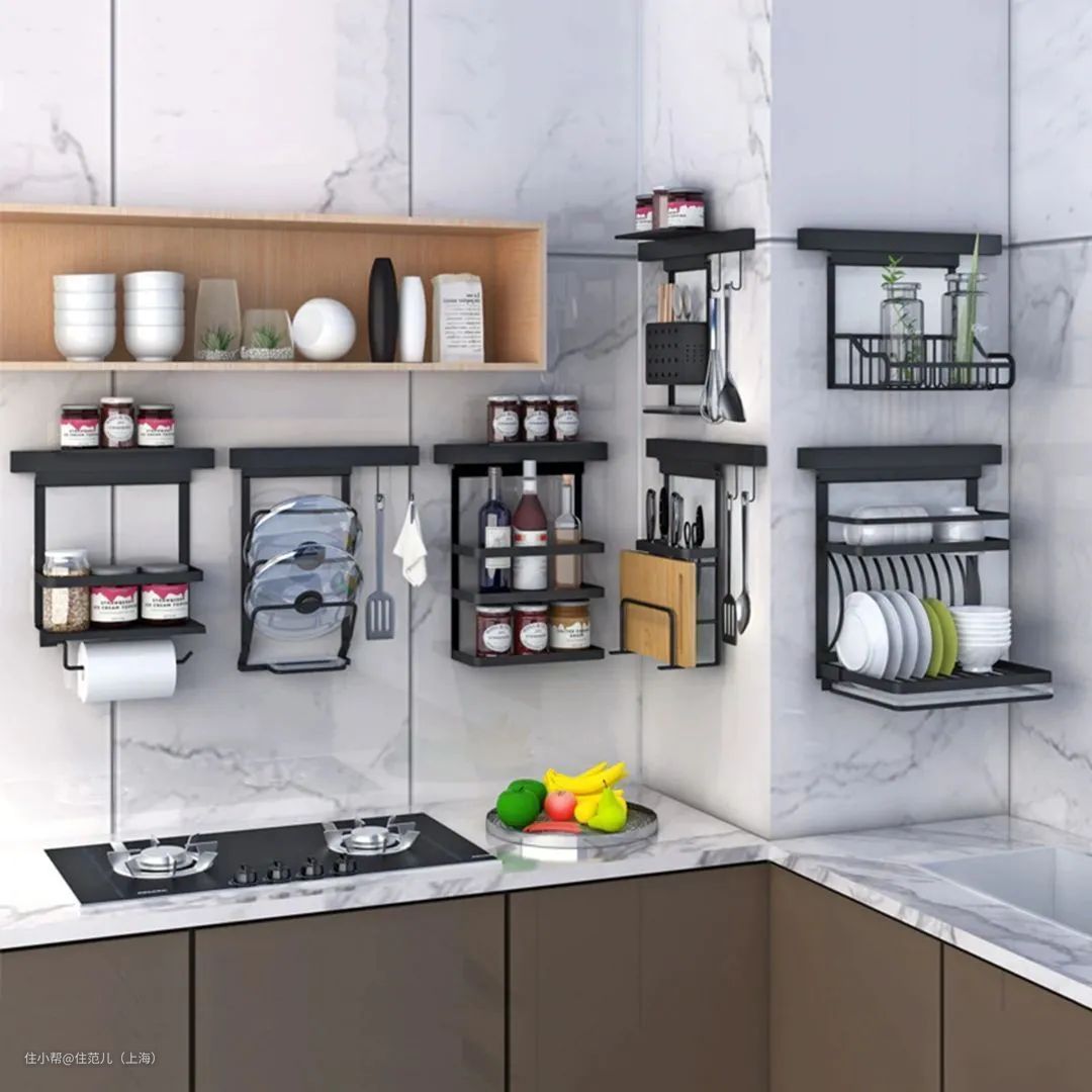 置物架有各种尺寸各种功能的,上墙是为了尽量节省出橱柜抽屉,毕竟地柜的空间也不富裕。
