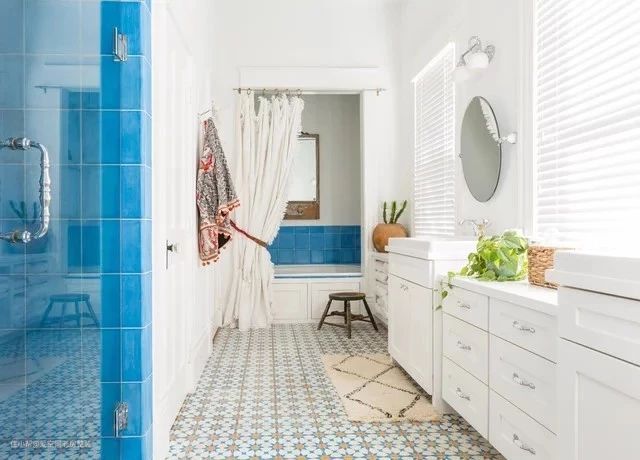 室内设计师玛丽莎·克莱默(Marissa Cramer)将图形化的水泥瓷砖,淋浴间的绿松石色地铁瓷砖,开放式原木架子结合在一起,增添了温暖和许多白色。这种组合感觉干净,清新又诱人,仿佛可以在里面蒸桑拿。