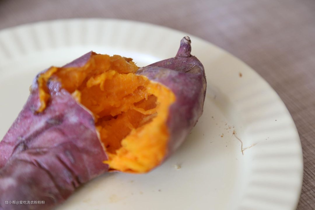 到了晚上,一份甜丝丝的烤红薯就是我的宵夜啦!用烤箱烤红薯怎么着也得将近一个小时,而空气炸锅跟烤红薯就实在是绝配了。因为本身空间比烤箱要小一些,再加上底部的大功率发热管和3D热风技术,整体工作效率是很高的。像我选的这种中等大小的红薯,洗干净丢进去,大概半小时就好了。