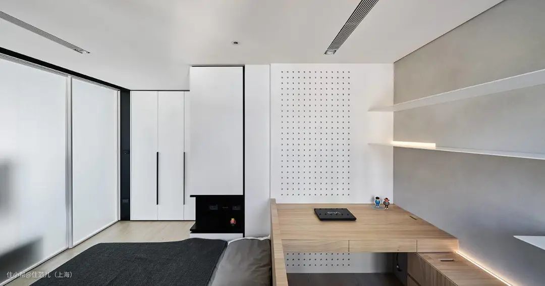 卧室的内侧是一个书房,书桌的侧墙同时也兼做床头板,上方打造了一整面墙的洞洞板,可以增加挂钩和隔板,为将来使用留出弹性。