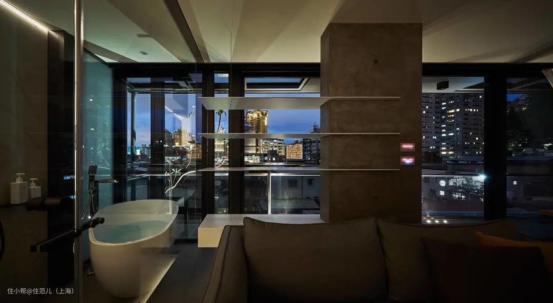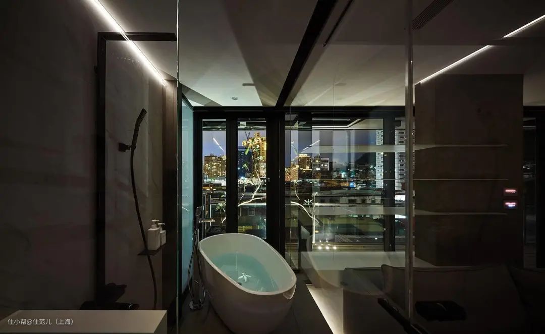 注意一个小细节:洗手台的台面穿过玻璃隔断,延伸到了淋浴区,变成了一个可置物的平台。