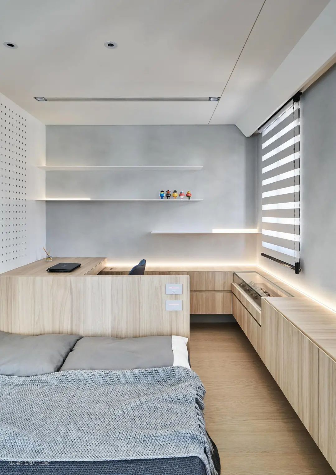 矮柜直接延伸至书桌下方,同时作为卧室柜和书房柜。