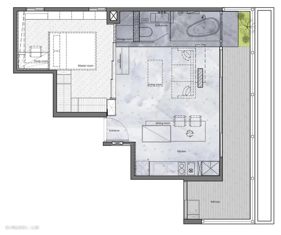 利用这个参差不齐的户型特点,设计师从容安排,让小小的空间也拥有浴缸、大中岛、书房、更衣室、客厅及卧室,并且一点都不拥挤。