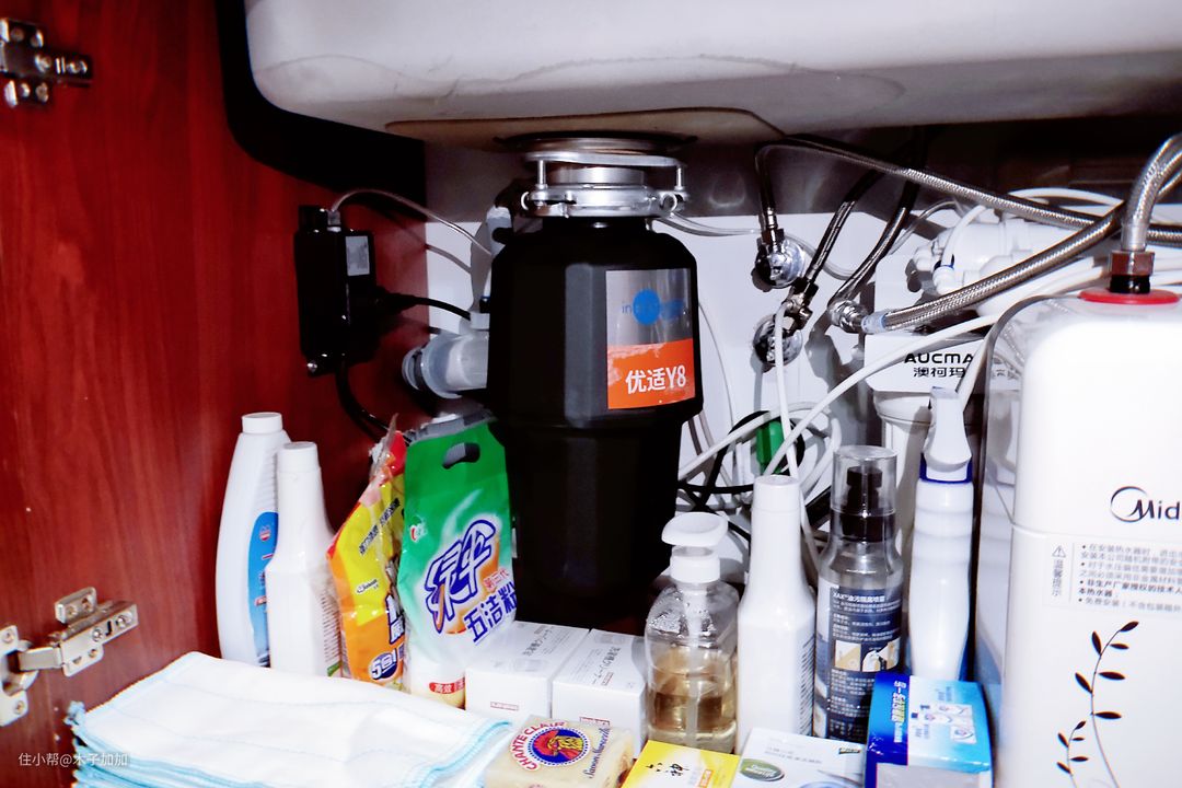 爱适易Y8垃圾处理器不仅体积小,不占用厨下储藏空间,而且颜值也不错,顺便也整理了厨下空间。而且还连接了洗碗机的接口,为以后的厨房升级也进行了预留。