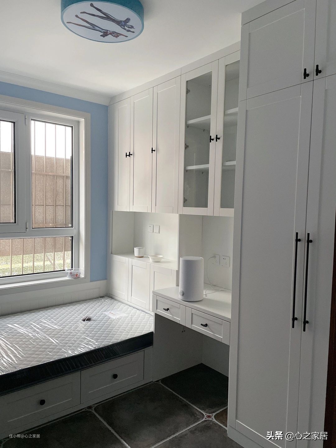 全屋几乎都是复古风格,但孩子的房间不能再继续复古风格,孩子一般都不会喜欢,唯一保留的就是复古的地砖,其他都坚持了现代时尚的设计。男孩房选择了蓝色墙壁,榻榻米+衣柜+书桌柜的组合,将小房间填充得很满,充实实用。