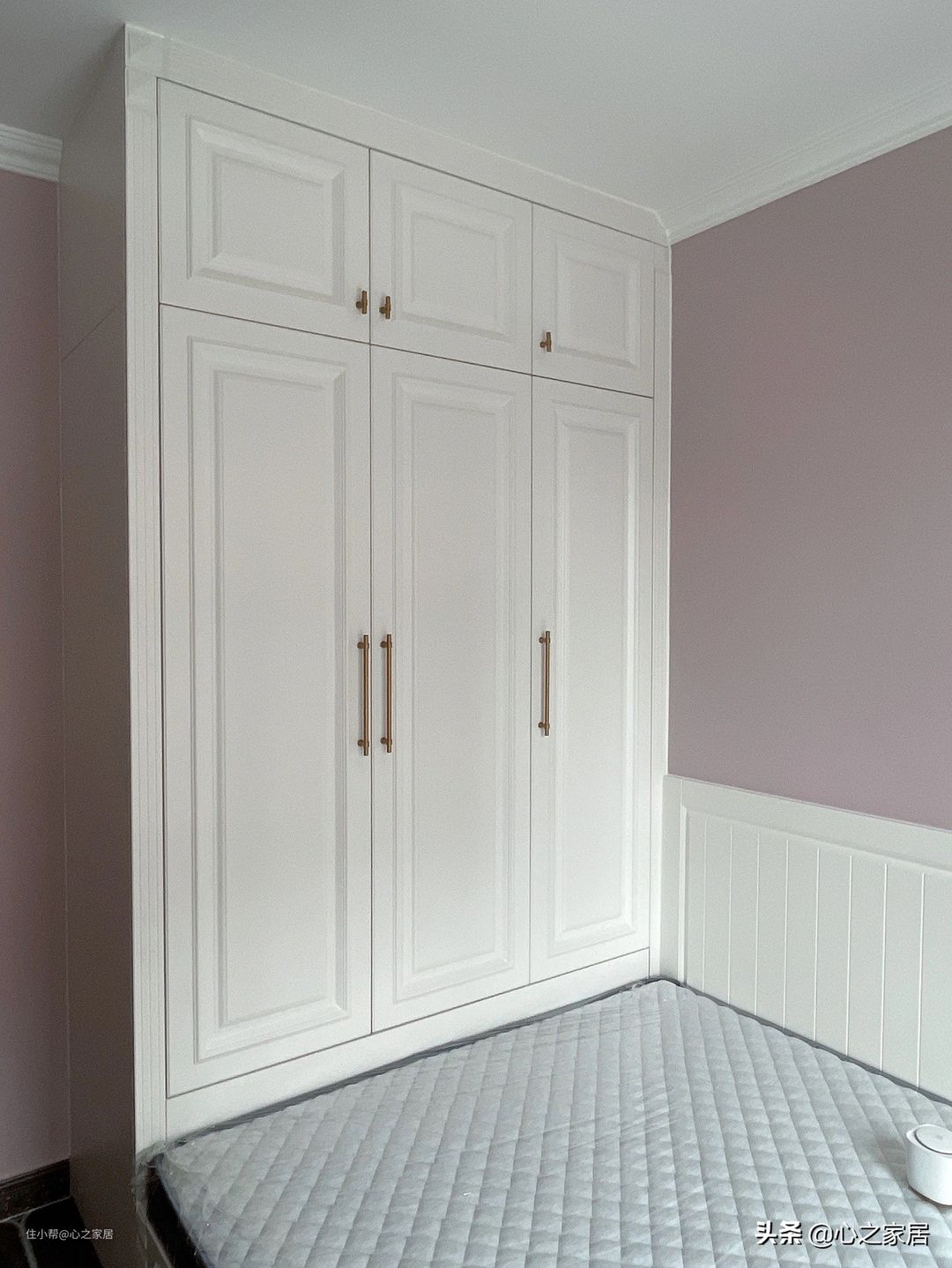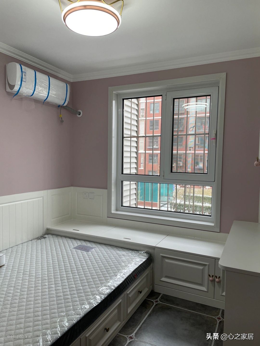 女儿房墙壁选择粉色,浪漫可爱,榻榻米+衣柜+飘窗柜+书桌柜的组合比男孩房多了一个飘窗柜,铺上软绒绒的垫子,打造一处浪漫的专属空间。
