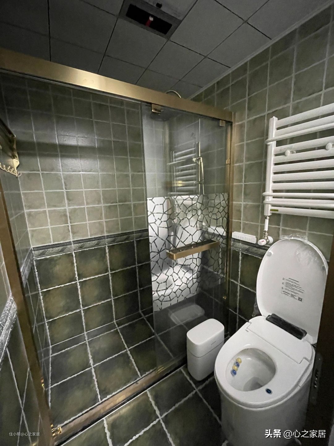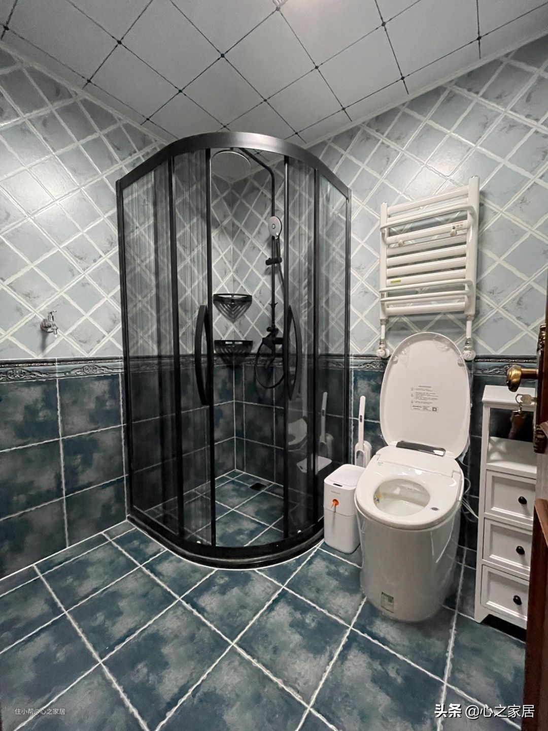 主卫长方形选择了三分离设计,依然的复古瓷砖,墙壁有腰线,复古的浴室柜,复古的镜柜、复古的壁灯,上个卫生间有种穿越的错觉感。