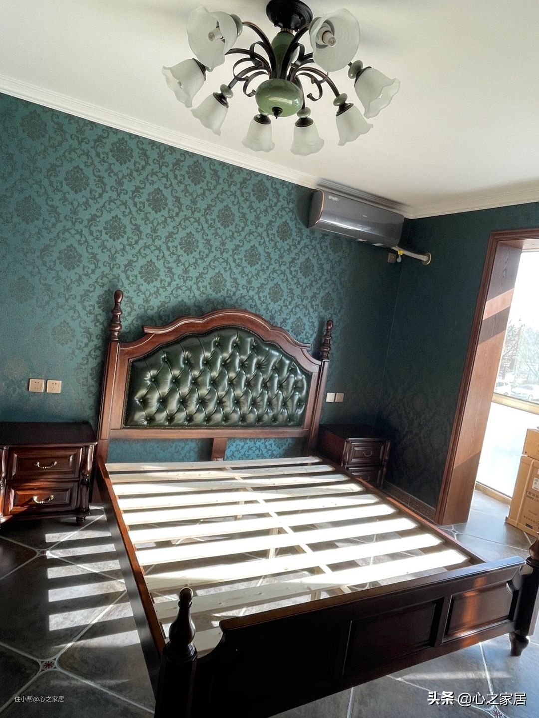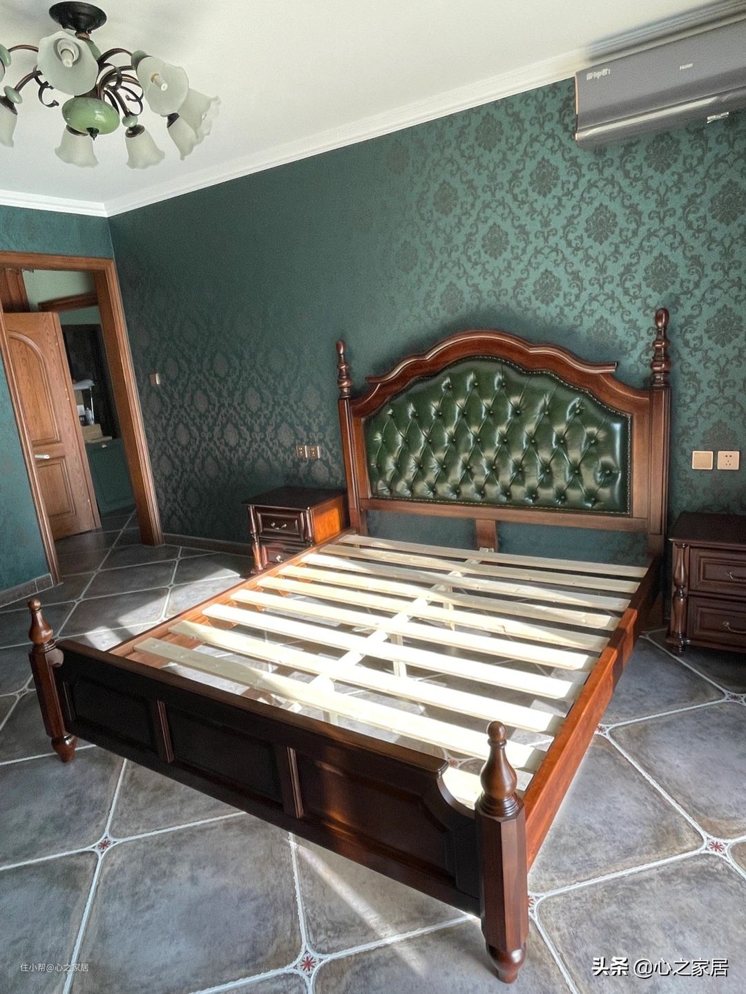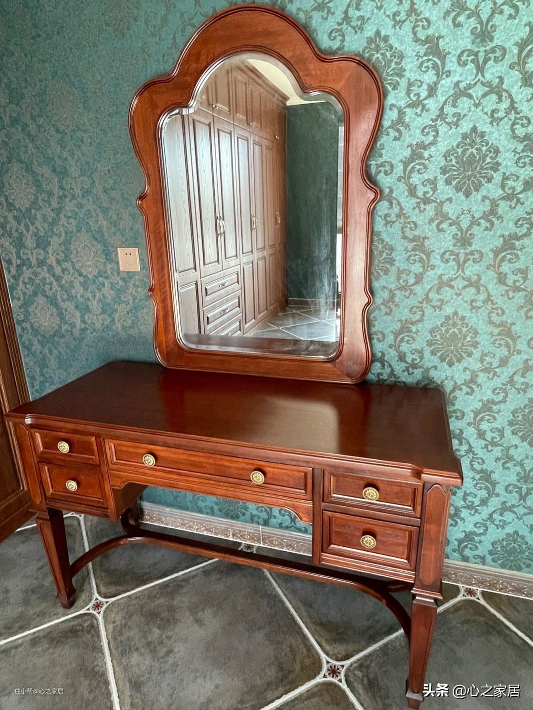 主卧整个墙壁都粘贴了绿色花纹墙布,依然的全套复古风格家具,最费时费力的就是整面墙的复古风格衣柜,十开门的衣柜收纳效果真不是一般的强大,放进去很多东西后,还会有很大空间。梳妆台气质不凡,很复古有种民国时期的韵味,给人一种感觉,它和它主人的背后应该有着很传奇的故事。
