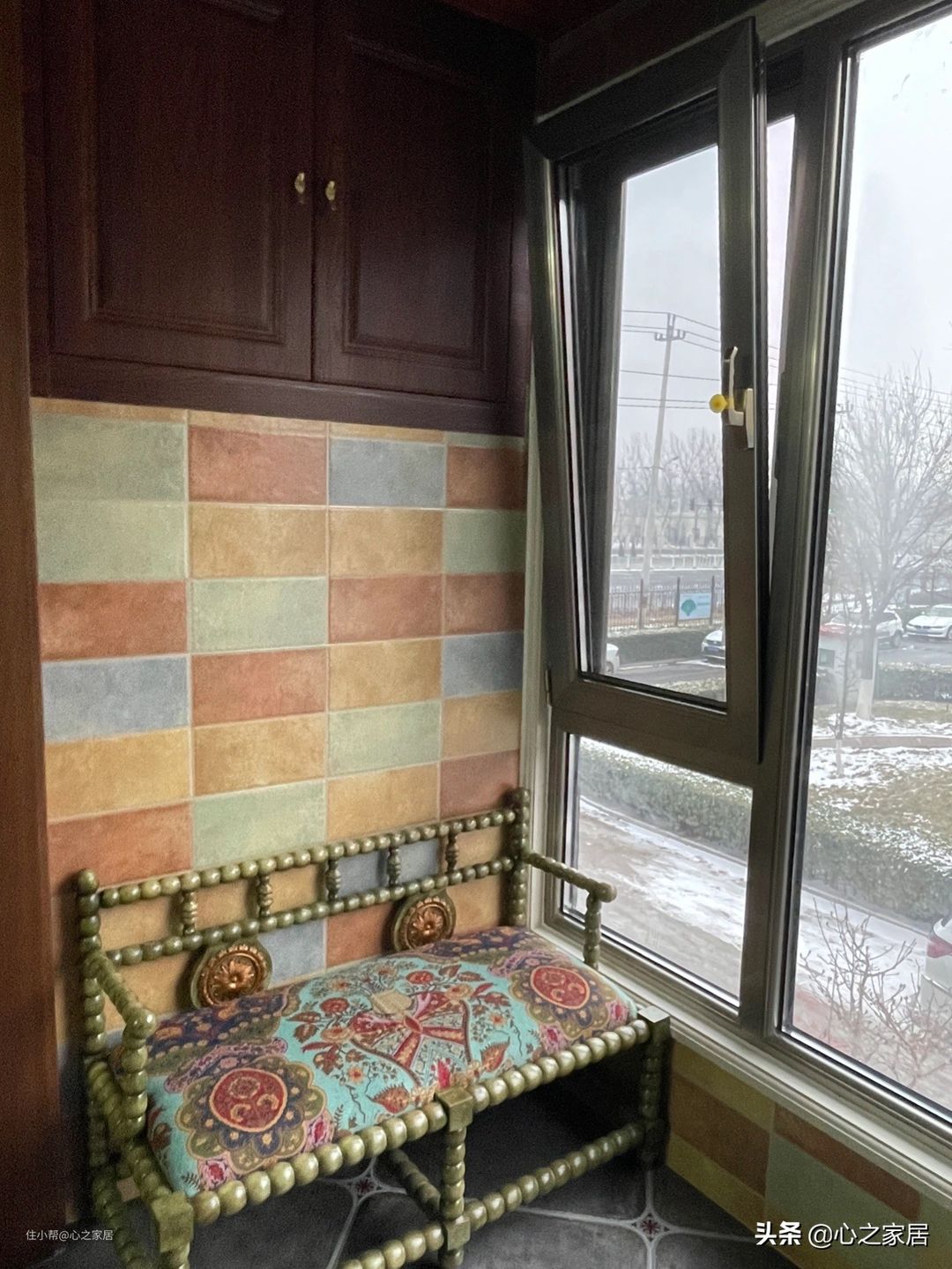 客厅阳台垭口也是实木封边,整个阳台用了复古砖上墙,看似花花绿绿,实际上却一点都不艳丽,倒是很柔和,独特的沙发椅很有西域风格,对面凹进去的空间没有定制阳台柜,而是胡桃木的置物柜,可以摆放收藏品,或是摆放一些绿植,为居家生活再增添一些活力。