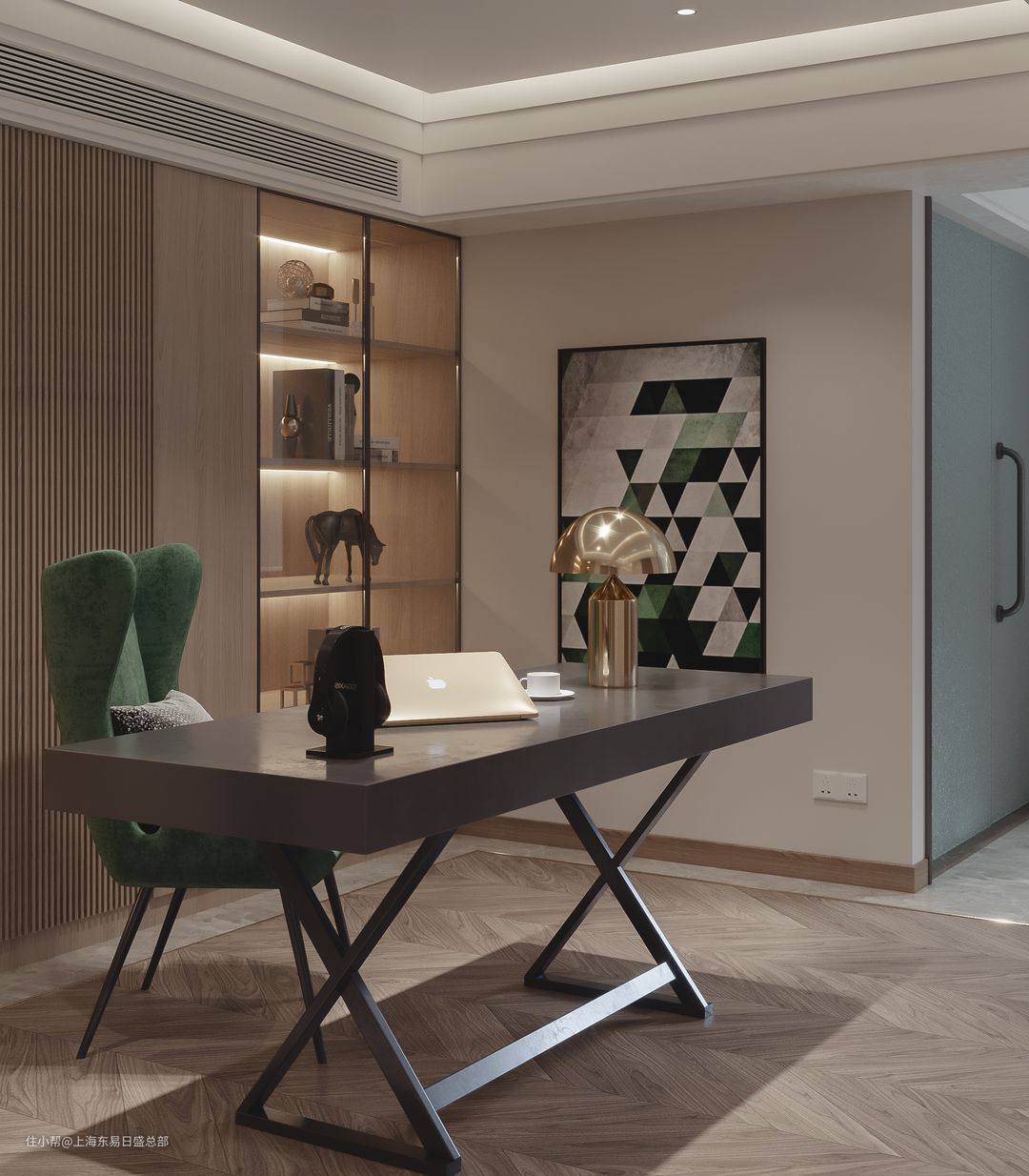 书房做了开放式的设计,简单布局营造大气敞亮的空间,仅摆放了一个书桌和单椅,男主人也可以在此阅读、游戏,也可以随时作为办公桌使用。墙面的几何装饰画呼应单椅的色调,让男主人在疲倦可以放松心情~