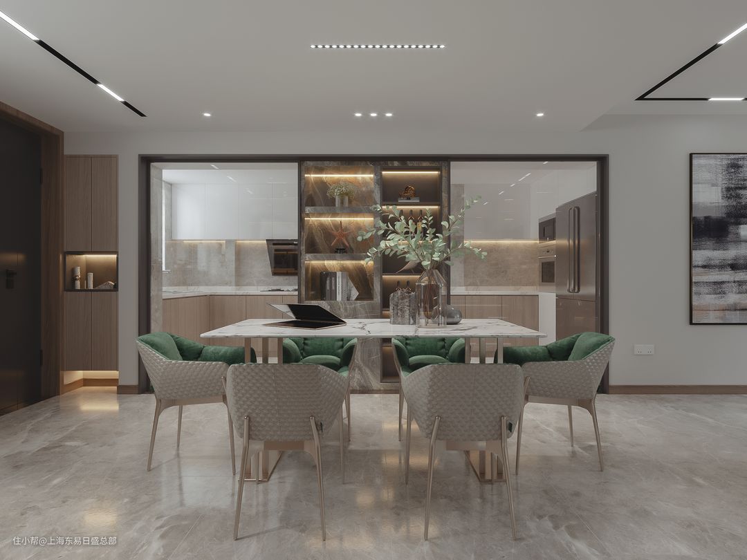 六人座的餐桌椅、开放式的空间布局和静谧低调的配色,营造出雅致端庄的用餐环境。吊顶延续客厅的设计,同样做了平面吊顶搭配内嵌式灯带,保证均匀通透的光线和敞亮舒适的层高。