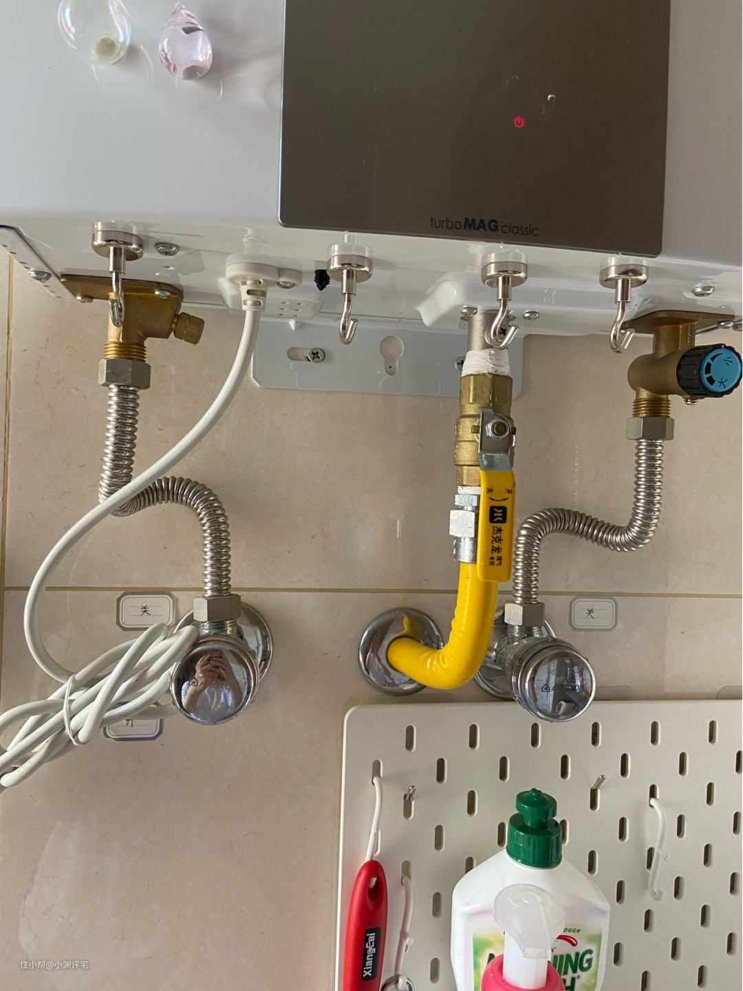 如果再给我一次机会的话,我应该直接把角阀放在橱柜里。再在橱柜和燃气热水器之间埋一根PVC管,将来直接用金属螺纹软管(水管)连接。这样热水器下面就不会再出现这一堆乱七八糟的管道了。