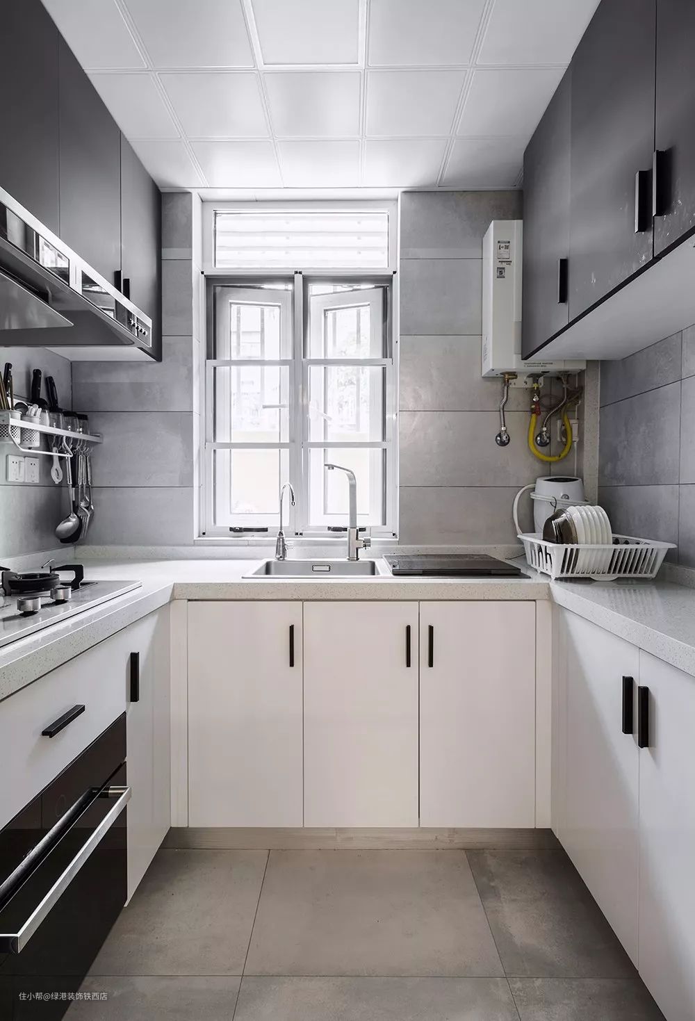 厨房采用了U型的橱柜布局,墙面的空间也被充分利用起来做收纳,保证台面的干净无一物。