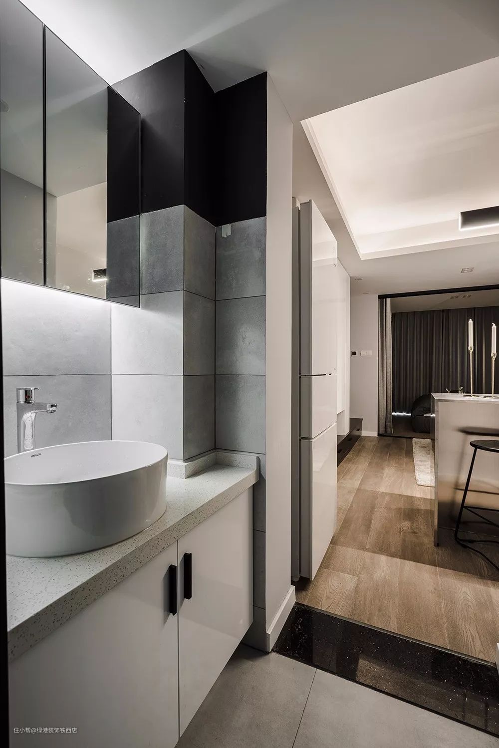 进门玄关利用墙面凹处,将卫生间干区嵌入进去,解放了卫生间空间。
