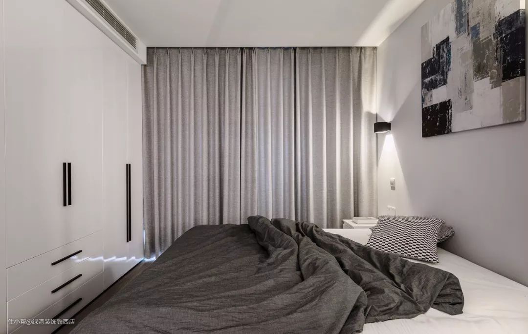 卧室两侧都是浅灰色窗帘,搭配灰色的床品,更有格调感。床尾定制了整面墙的衣柜,大大增加了收纳空间。