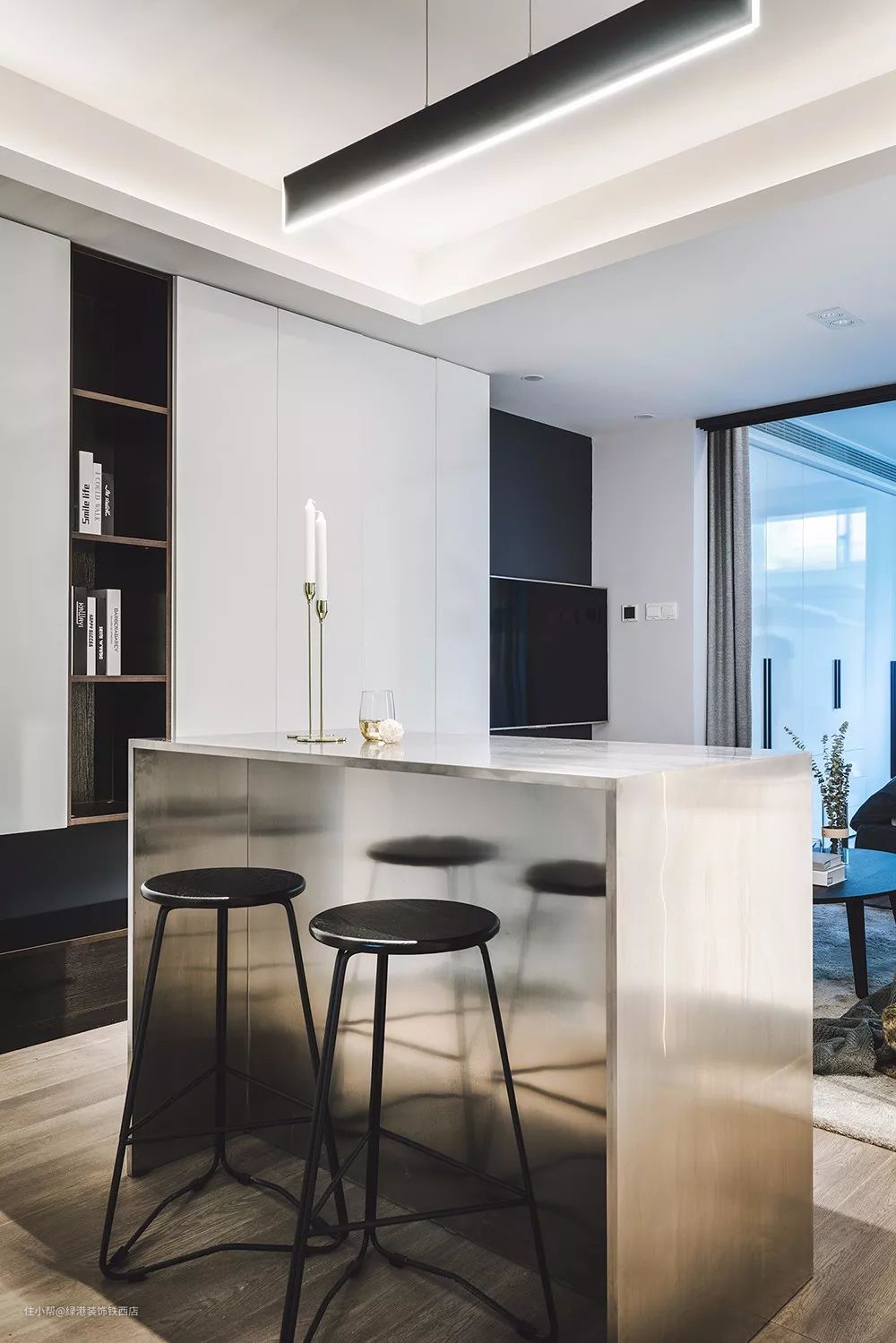 在厨房与客厅之间打造一个小吧台,作为简单的用餐区,底部留空平时把椅子给塞进去。