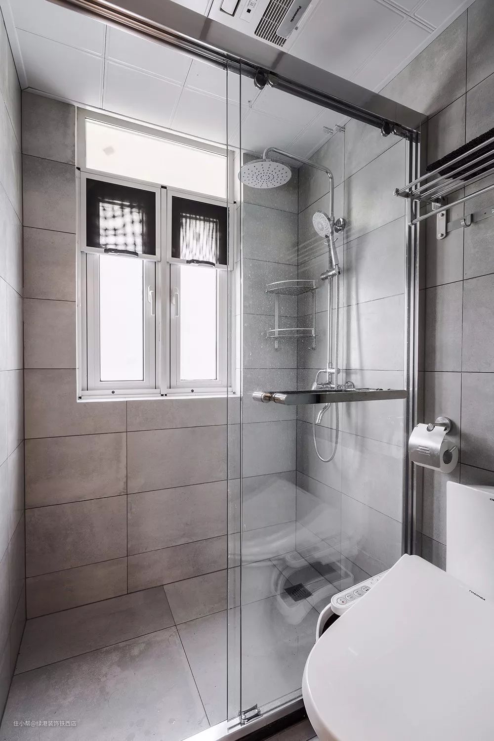 卫生间内部采用玻璃推拉门做了干湿分离,做彻底的三分离设计,实用方便。整体以灰色调为主,让人感觉更时尚简洁还耐脏。