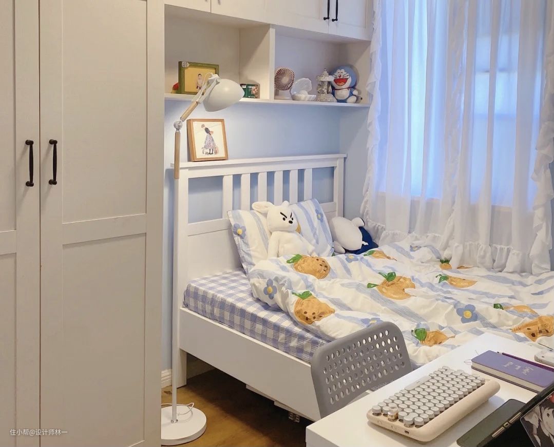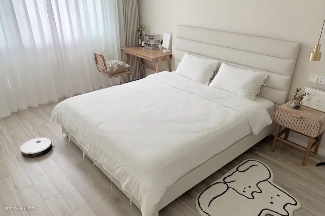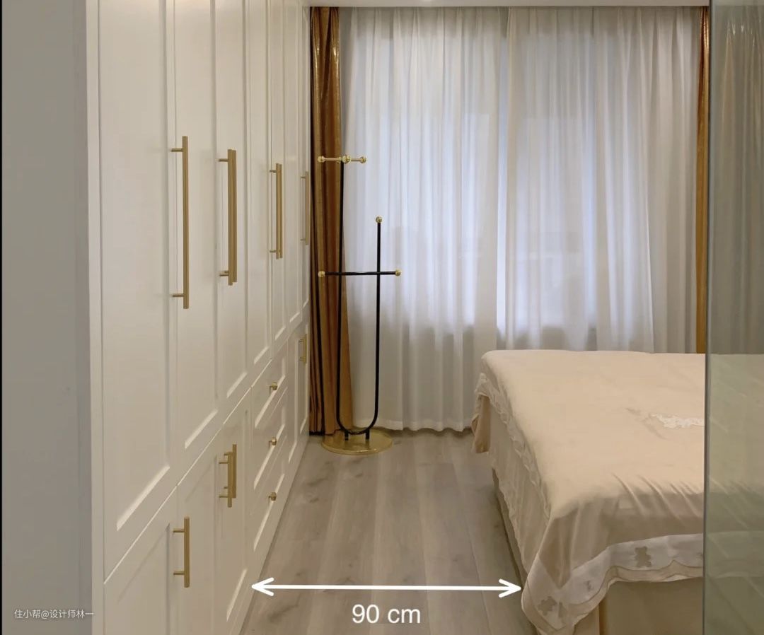 床的面积应≤卧室面积的1/2,两边都不靠墙的床,两侧应分别留65cm方便走动,床尾到墙的距离90~120cm为最佳,床到衣柜的距离应>60cm,方便拿取衣物。