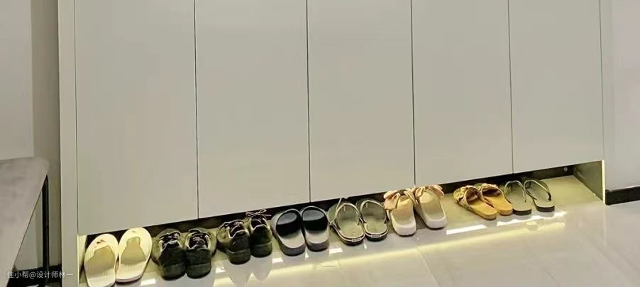 ①鞋柜的底部做镂空设计,之前我家设计师设计的是18公分,后面却发现18公分还是不够,所以在这里建议大家,最好留够20公分;