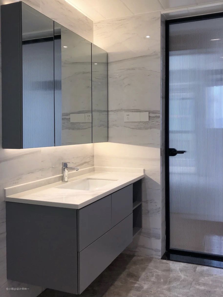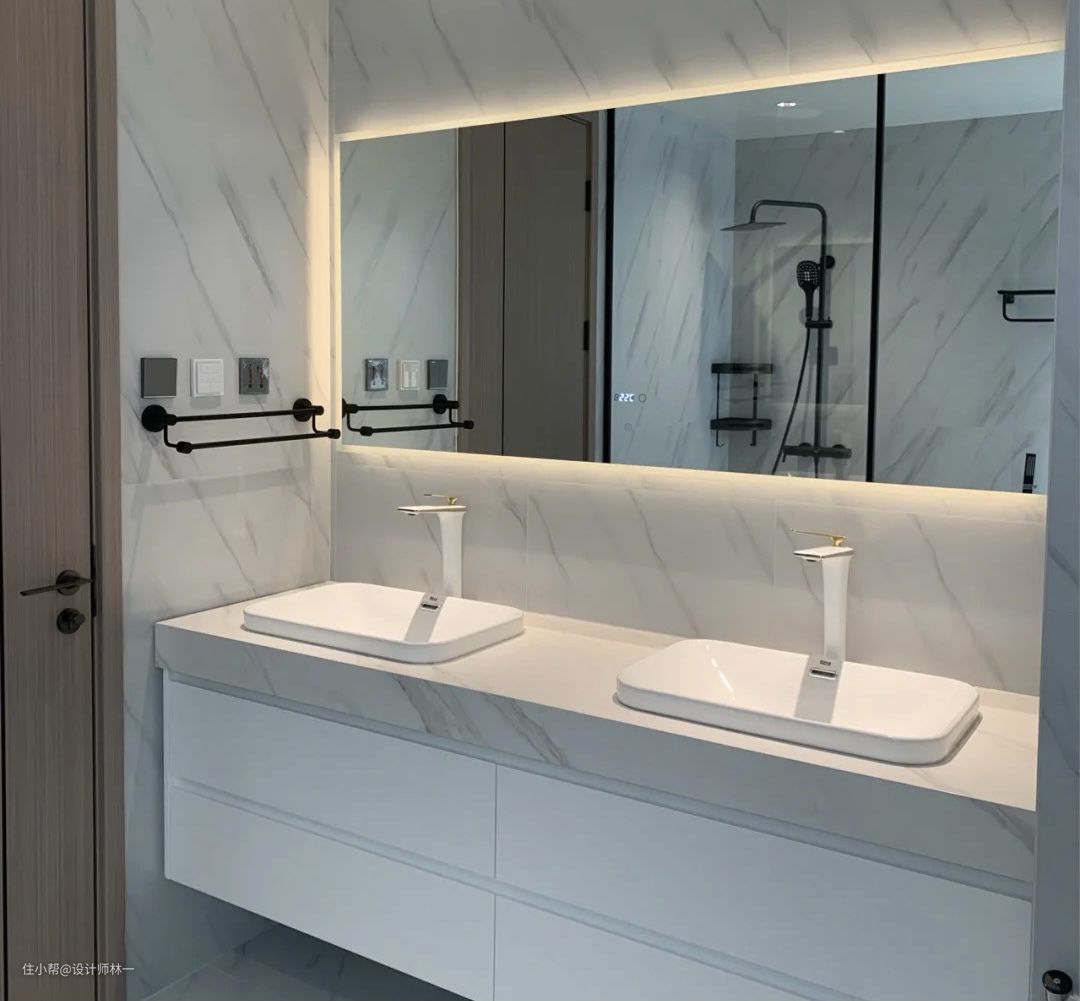 镜子或者镜柜与浴室柜台面的距离40cm为最佳,镜柜的顶距离地面185cm-200cm为最佳。