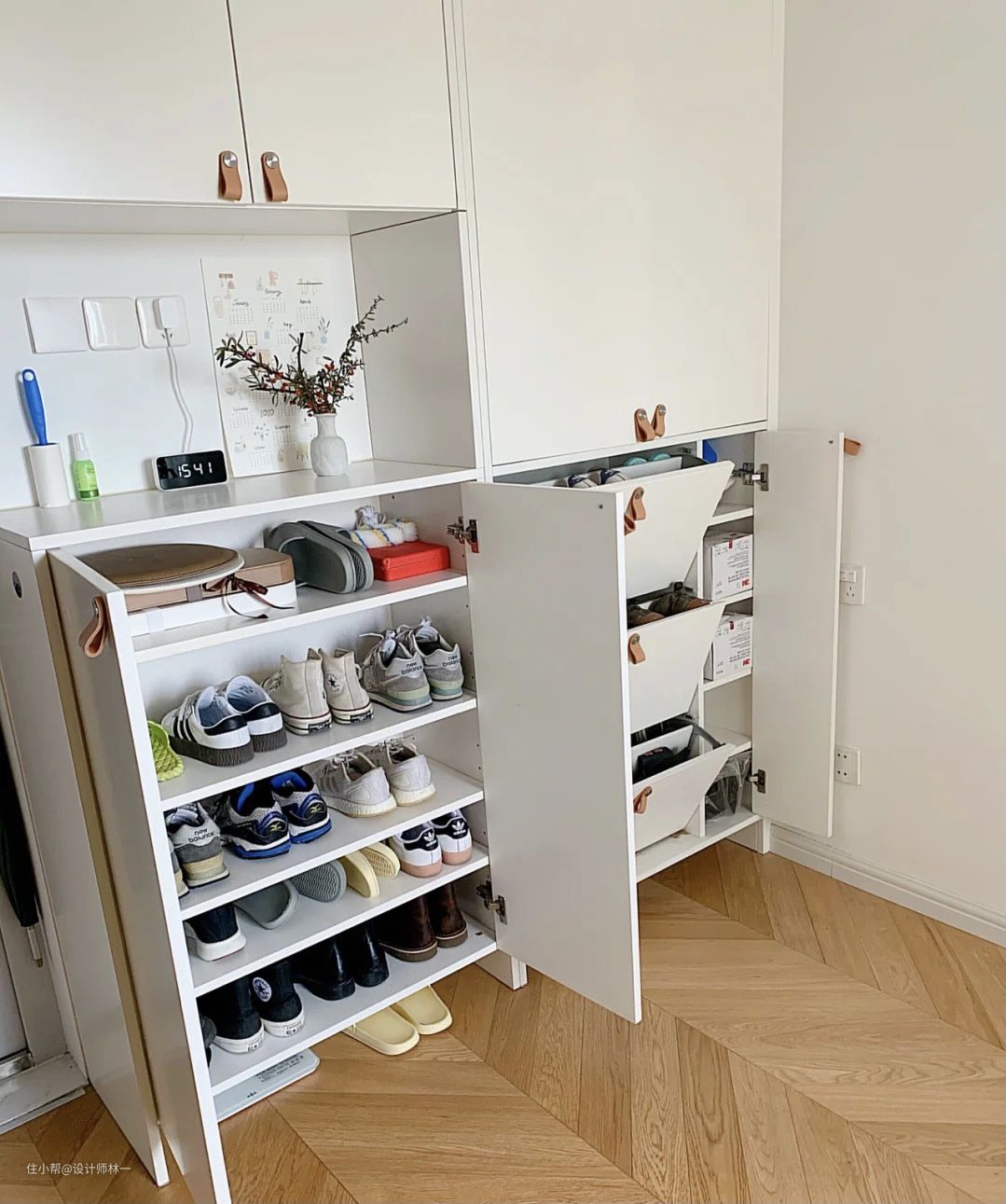 ③鞋柜上下层板的间距一般为16公分,但这个尺寸并不适合所有的鞋子,所以建议大家最好做活动层板,这样就可以根据鞋子高度随意调节高度;