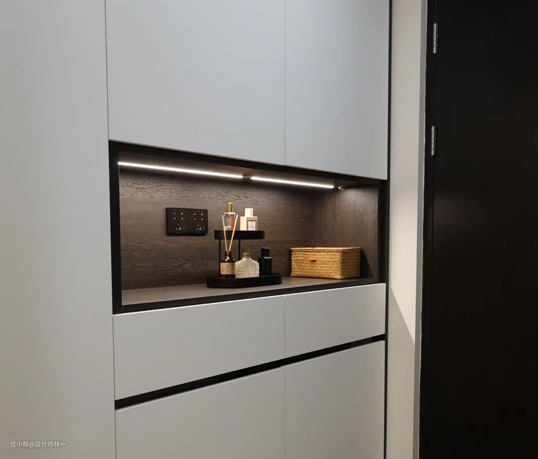 ④鞋柜中部镂空位置,建议大家留35公分,这样不仅能收纳小件物品,还能放置一些装饰物品,也方便后面装一个智能感应灯,来增添回家的仪式感;